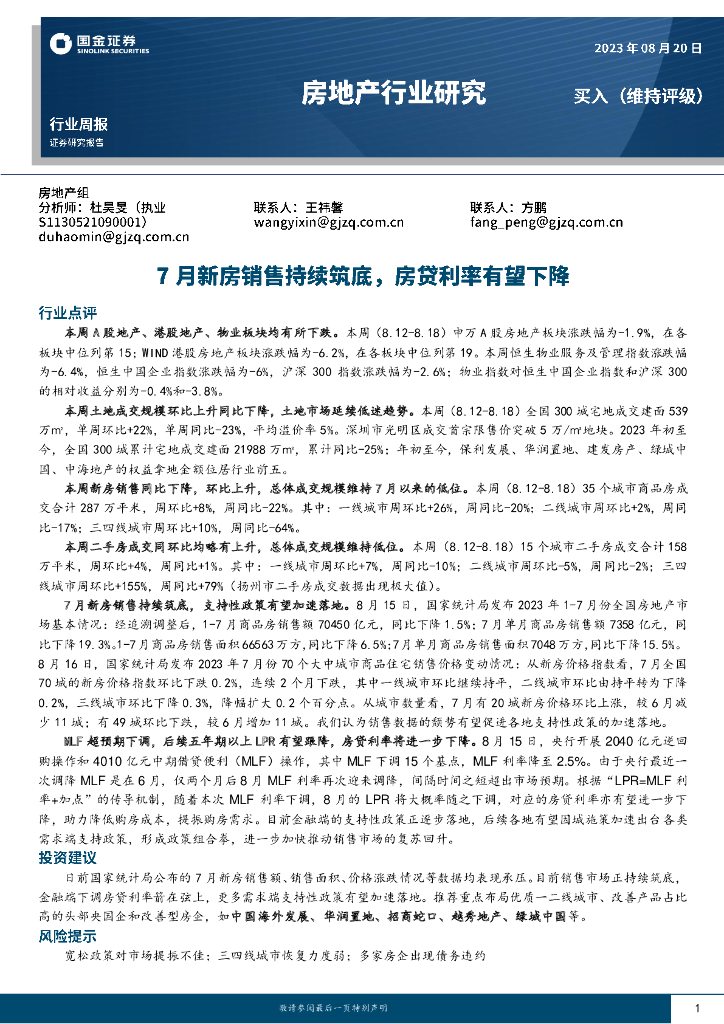 国金证券:房地产行业研究:7月新房销售持续筑底,房贷利率有望下降.pdf