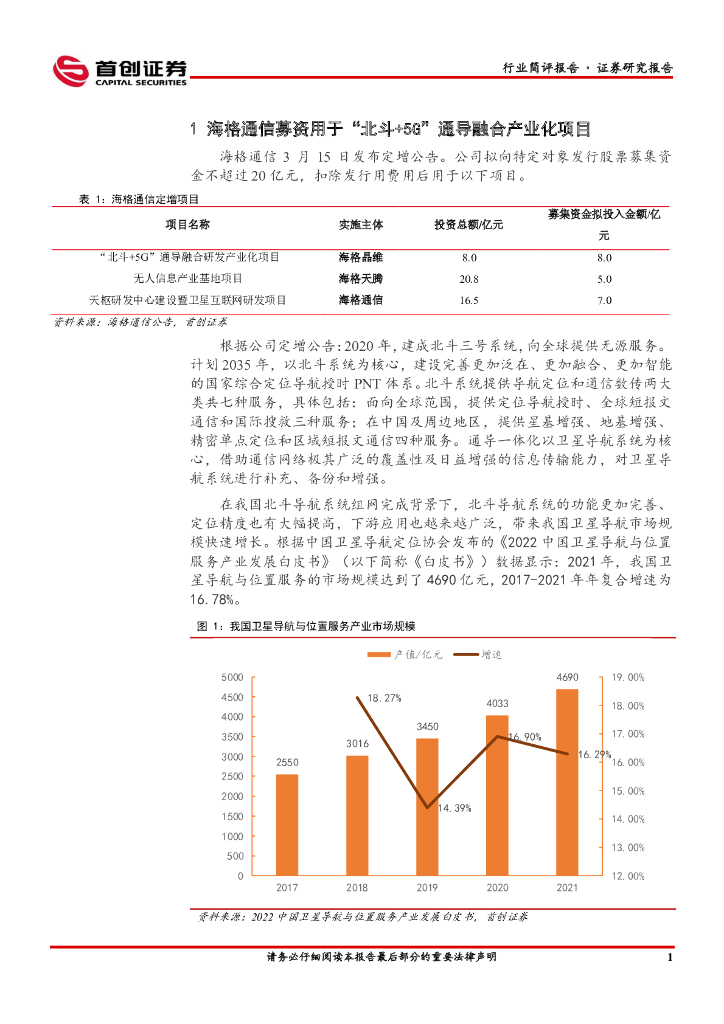 首创证券:国防军工行业简评报告:海格通信募集资金部分用于“北斗+5G”产业化项目,军民共振推动北斗产业链快速成长.pdf