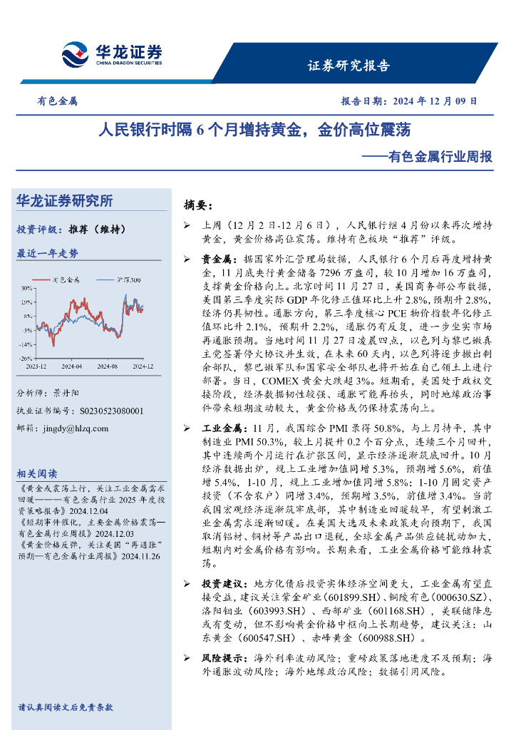 华龙证券:有色金属行业周报:人民银行时隔6个月增持黄金,金价高位震荡.pdf