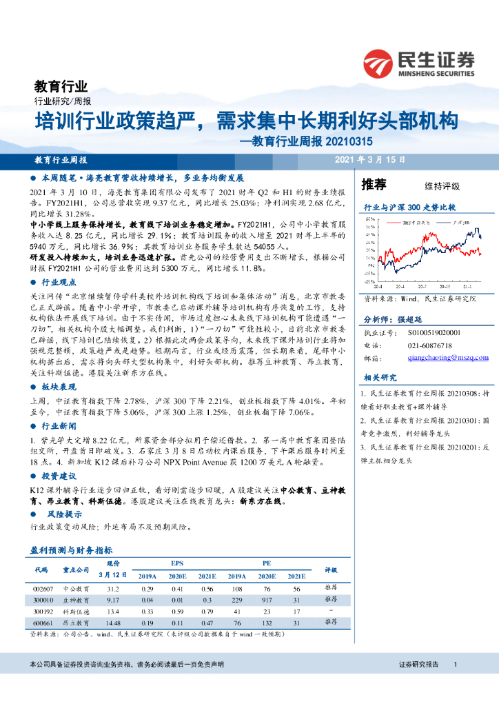 民生证券:教育行业周报:培训行业政策趋严,需求集中长期利好头部机构.pdf