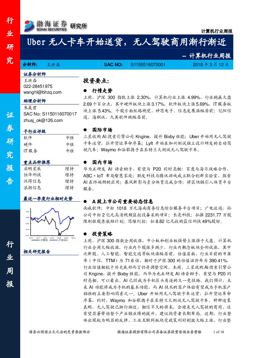 渤海证券:计算机行业周报:Uber无人卡车开始送货,无人驾驶商用渐行渐近.pdf
