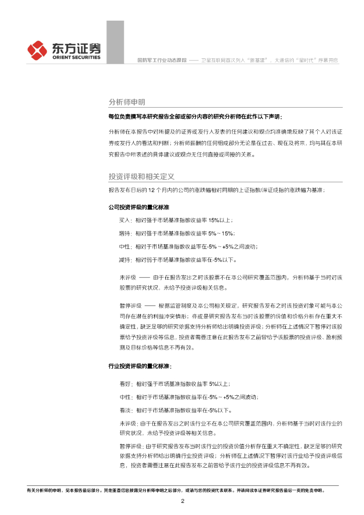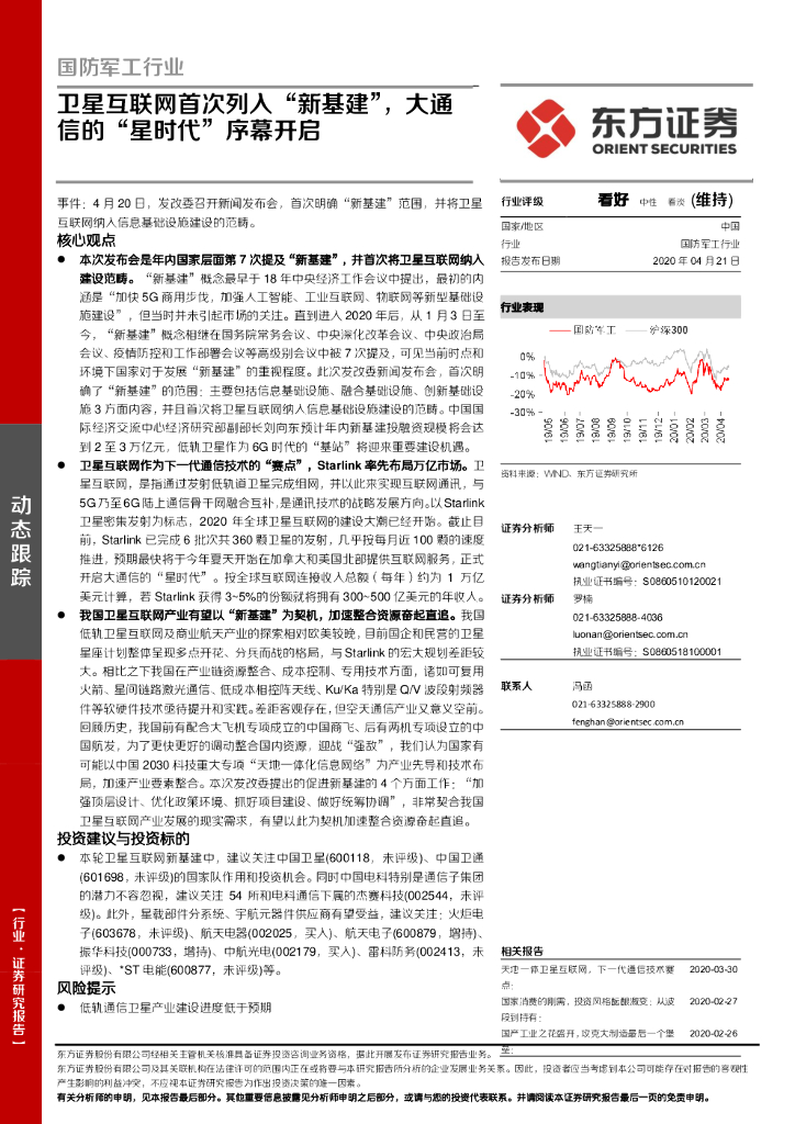 东方证券:国防军工行业:卫星互联网首次列入“新基建”,大通信的“星时代”序幕开启.pdf