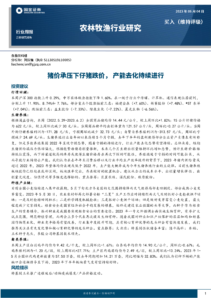 国金证券:农林牧渔行业研究:猪价承压下仔猪跌价,产能去化持续进行.pdf