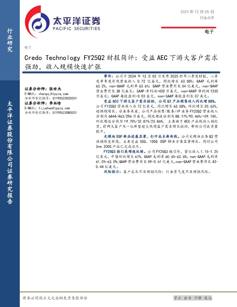 太平洋证券:电子:CredoTechnologyFY25Q2财报简评:受益AEC下游大客户需求强劲,收入规模快速扩张.pdf