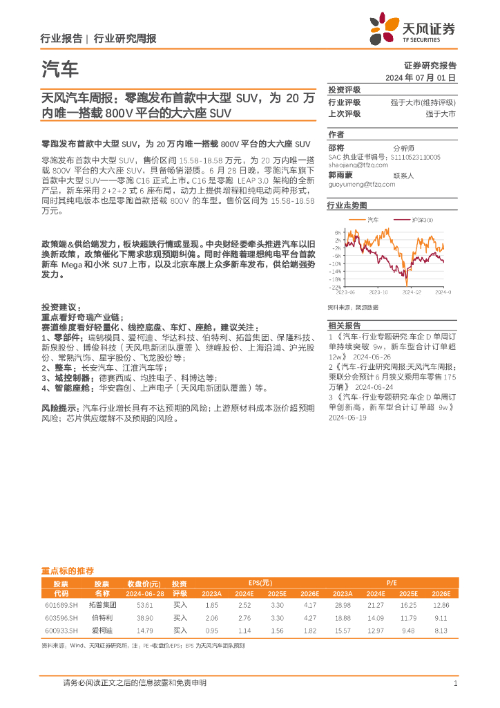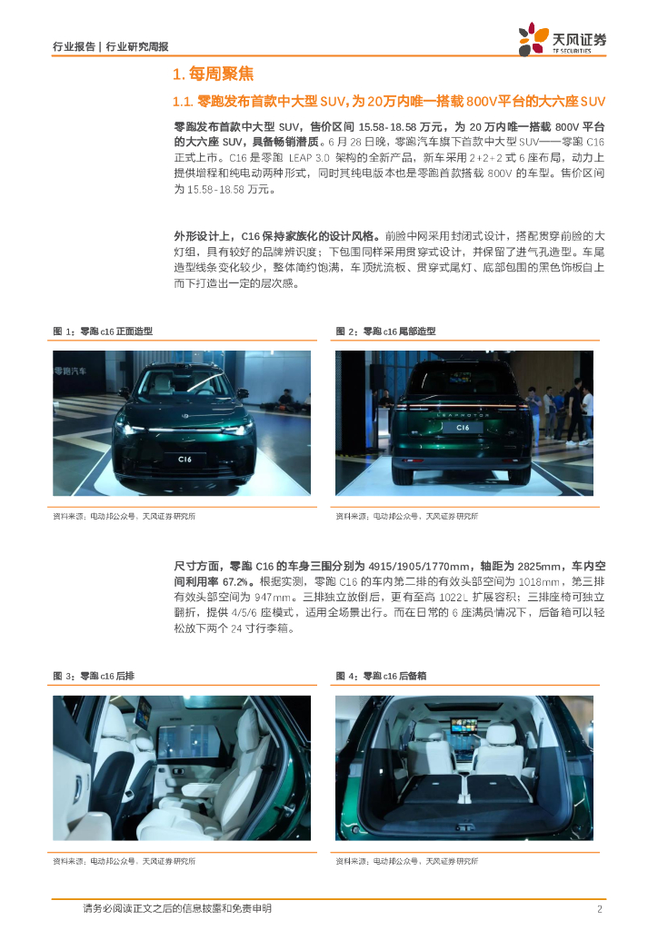 天风证券:天风汽车周报:零跑发布首款中大型SUV,为20万内唯一搭载800V平台的大六座SUV.pdf