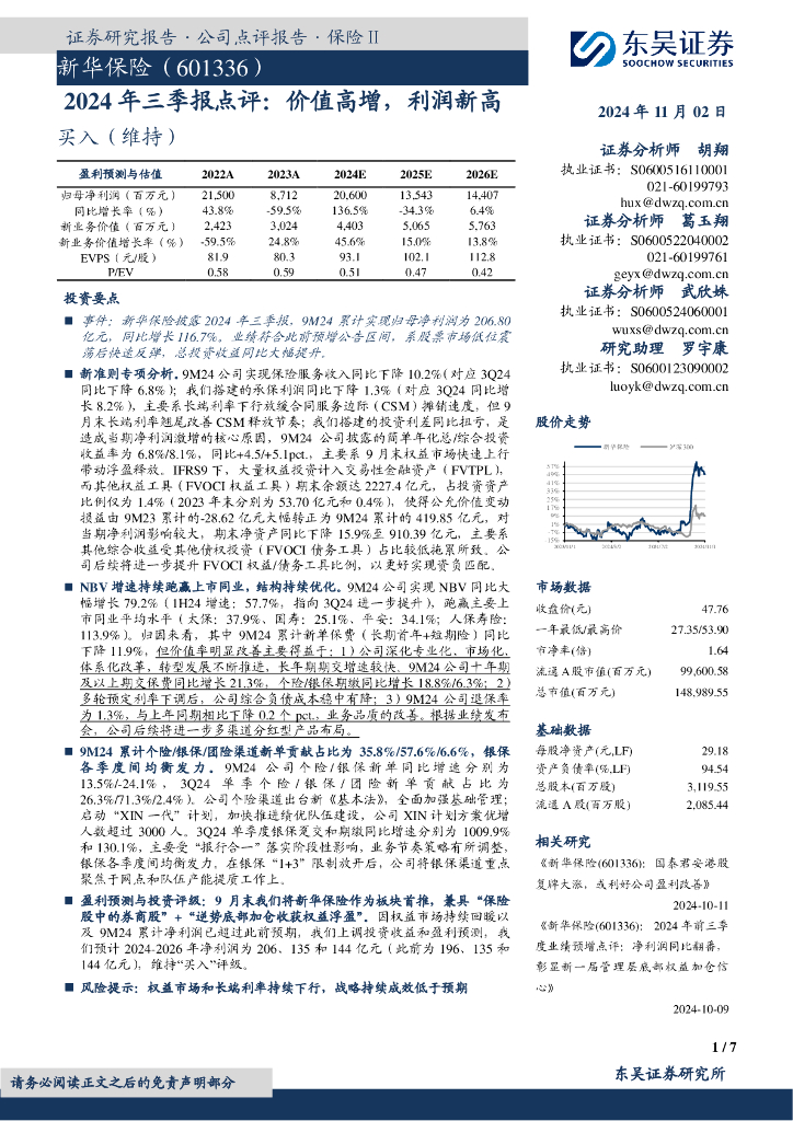 东吴证券:新华保险(601336)-2024年三季报点评:价值高增,利润新高.pdf