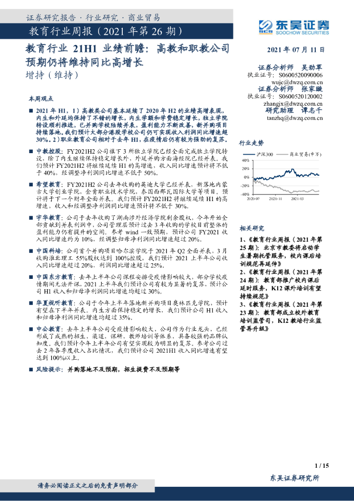 东吴证券:教育行业21H1业绩前瞻:高教和职教公司预期仍将维持同比高增长.pdf