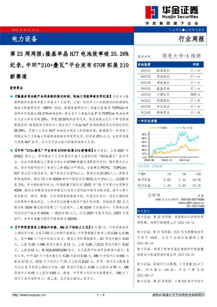 华金证券:电力设备第23周周报:隆基单晶HJT电池效率破25.26%纪录,中环“210+叠瓦”平台发布670W拓展210新赛道.pdf