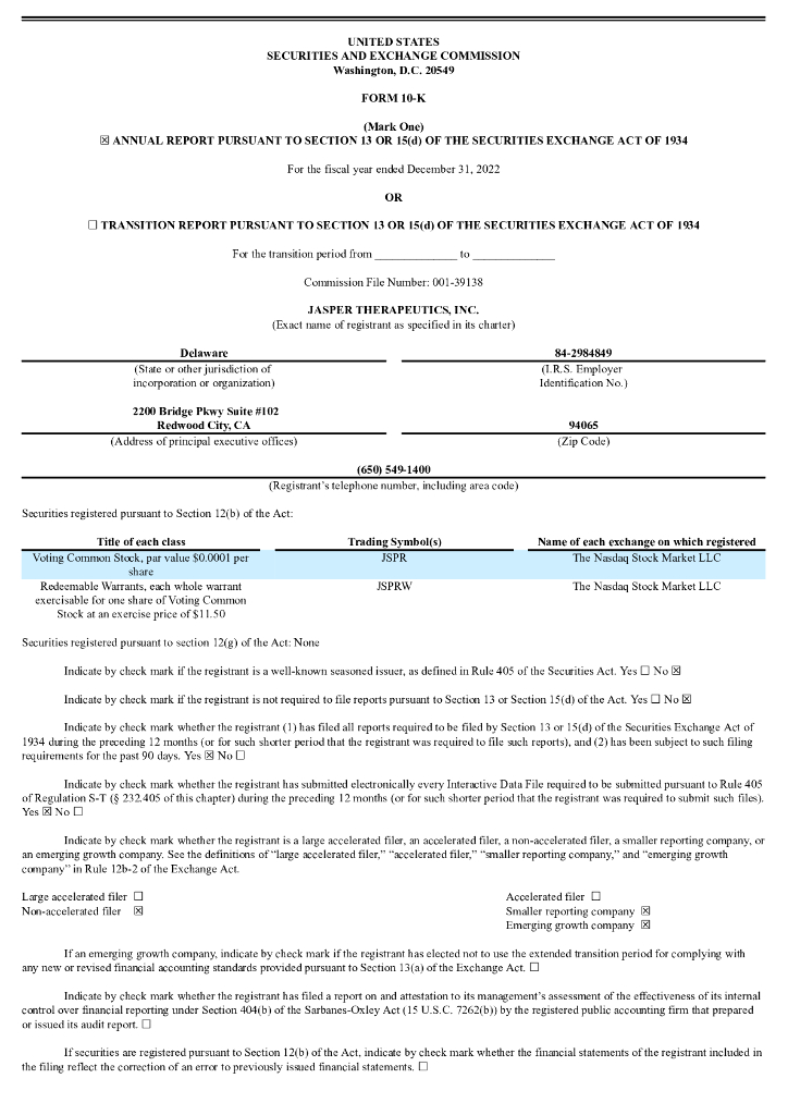 Jasper Therapeutics, Inc.(JSPR)2022财年年度报告(英文版).pdf