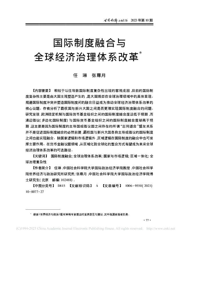 世界经济与政治:2023年第10期-国际制度融合与全球经济治理体系改革.pdf