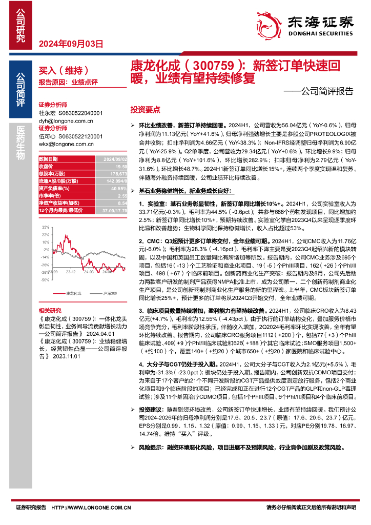 东海证券:康龙化成(300759)-公司简评报告:新签订单快速回暖,业绩有望持续修复.pdf