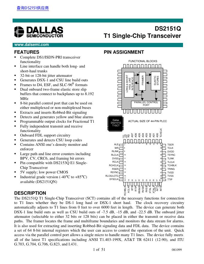 DALLAS DS2151Q T1 Single-Chip Transceiver 数据手册.pdf