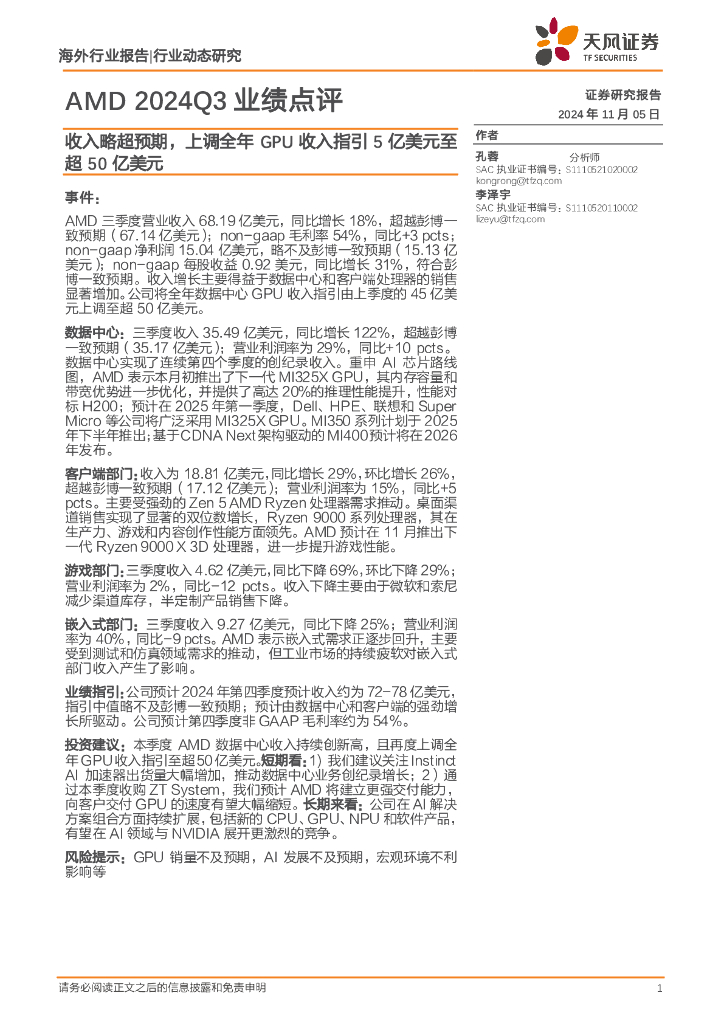 天风证券:AMD2024Q3业绩点评:收入略超预期,上调全年GPU收入指引5亿美元至超50亿美元.pdf