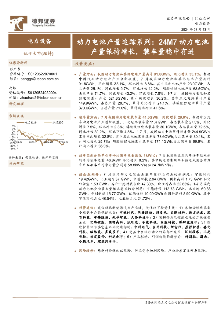德邦证券:动力电池产量追踪系列:24M7动力电池产量保持增长,装车量稳中有进.pdf