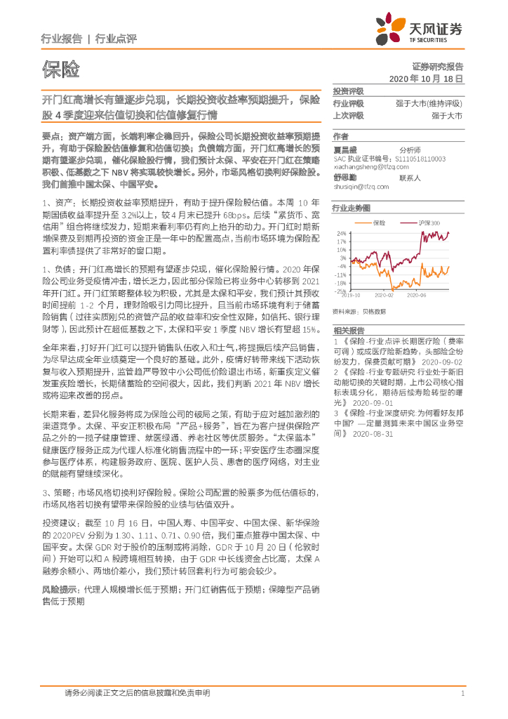 天风证券:保险行业点评:开门红高增长有望逐步兑现,长期投资收益率预期提升,保险股4季度迎来估值切换和估值修复行情.pdf