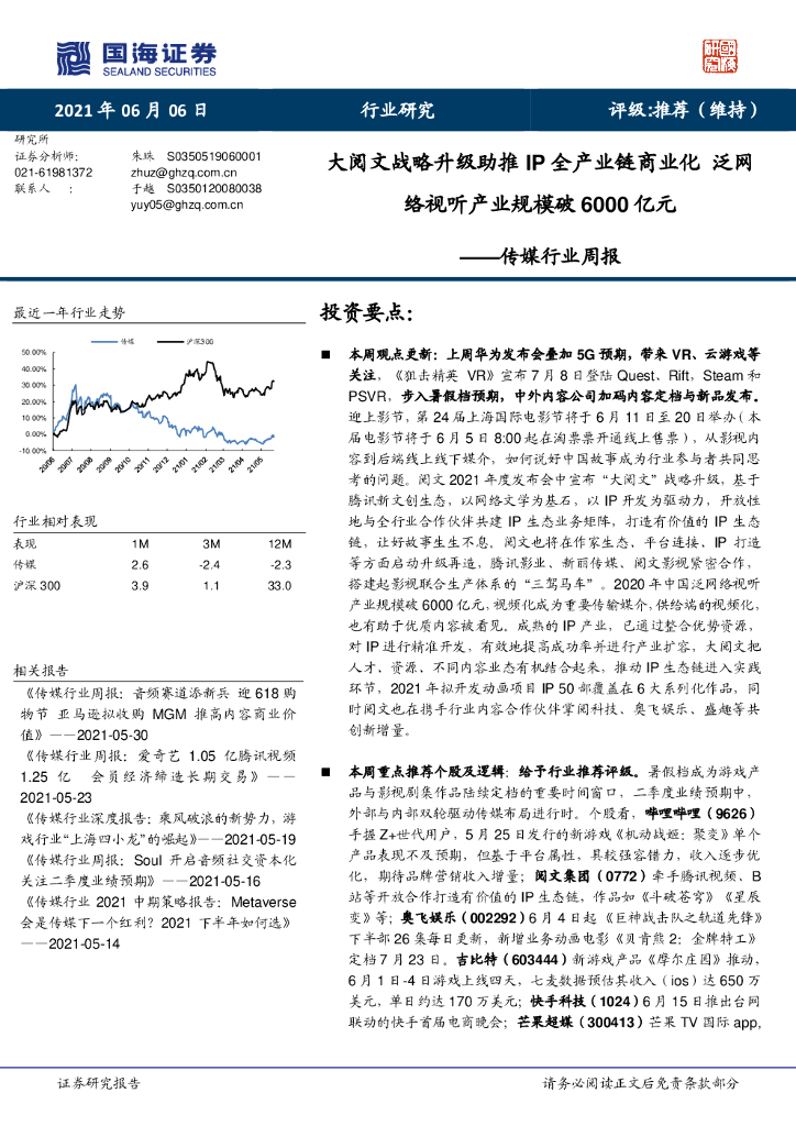 国海证券:传媒行业周报:大阅文战略升级助推IP全产业链商业化 泛网络视听产业规模破6000亿元.pdf