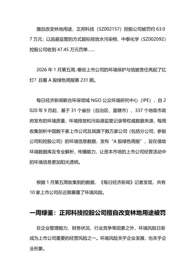 IPE公众环境研究中心:A股绿色周报(2026年1月30 总第231期)10家上市公司暴露环境风险 正邦科技控股公司擅自改变林地用途被罚63万元.pdf