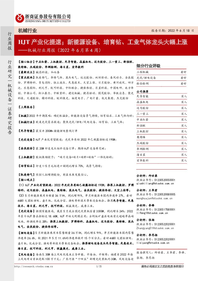 浙商证券:机械行业周报(2022年6月第4周):HJT产业化提速; 新能源设备、培育钻、工业气体龙头大幅上涨.pdf