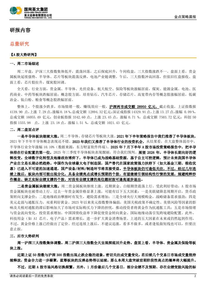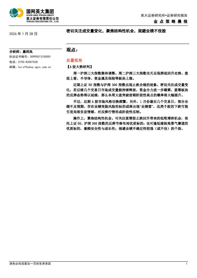 英大证券:金点策略晨报:密切关注成交量变化,聚焦结构性机会,规避业绩不佳股-260128.pdf