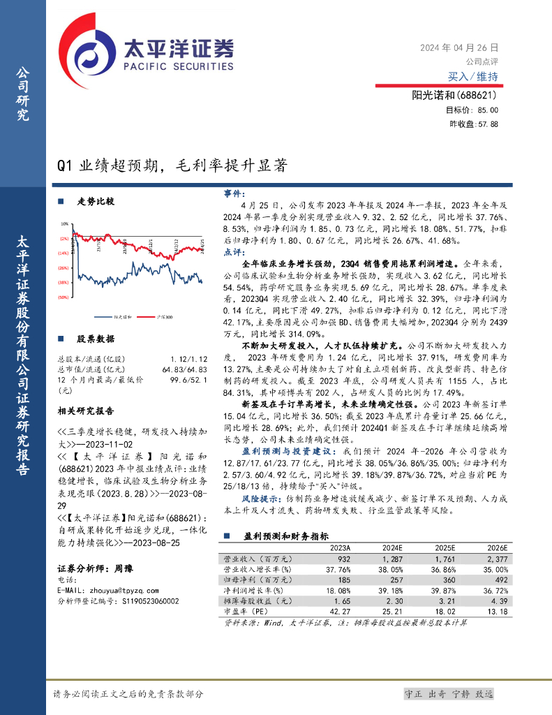太平洋证券:阳光诺和(688621)-Q1业绩超预期,毛利率提升显著.pdf