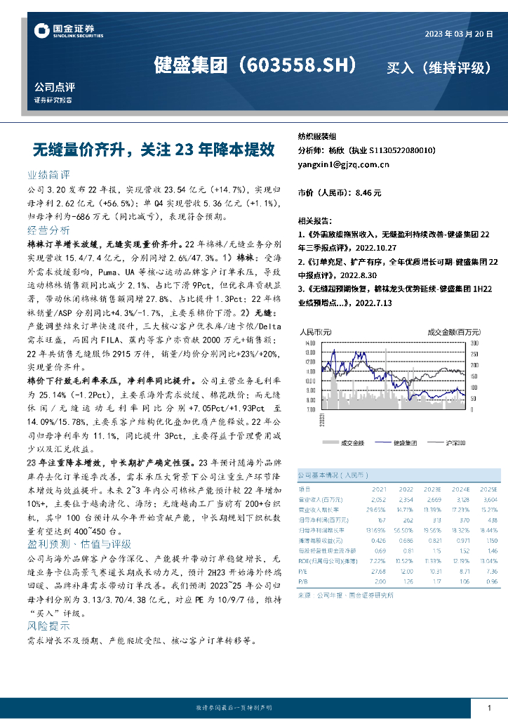 国金证券:健盛集团(603558)-无缝量价齐升,关注23年降本提效.pdf
