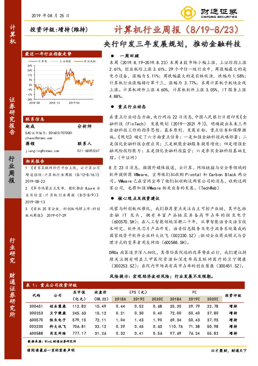 财通证券:计算机行业周报:央行印发三年发展规划,推动金融科技.pdf