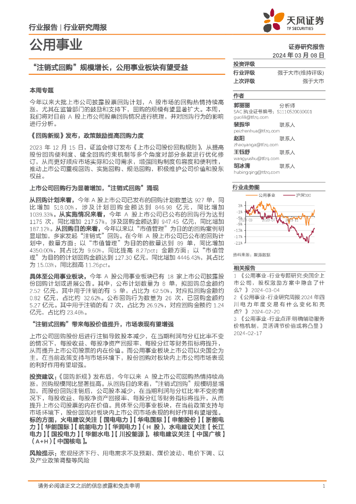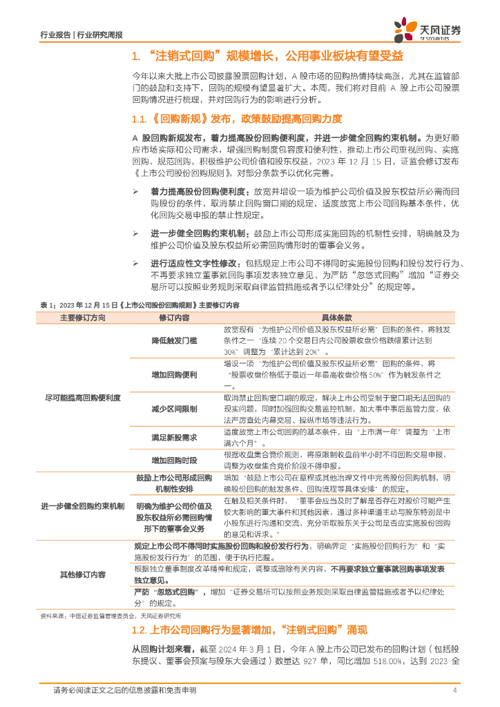 天风证券:公用事业行业研究周报:“注销式回购”规模增长,公用事业板块有望受益.pdf