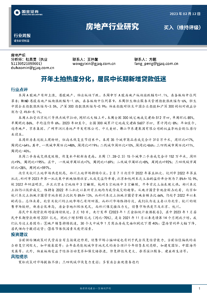 国金证券:房地产行业研究:开年土拍热度分化,居民中长期新增贷款低迷.pdf