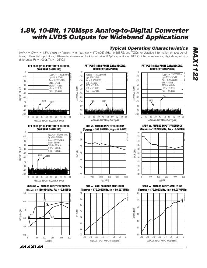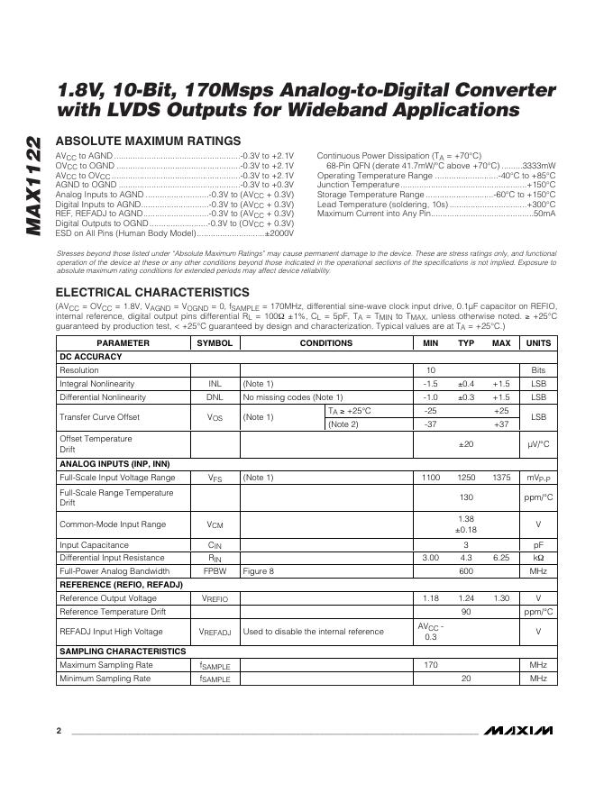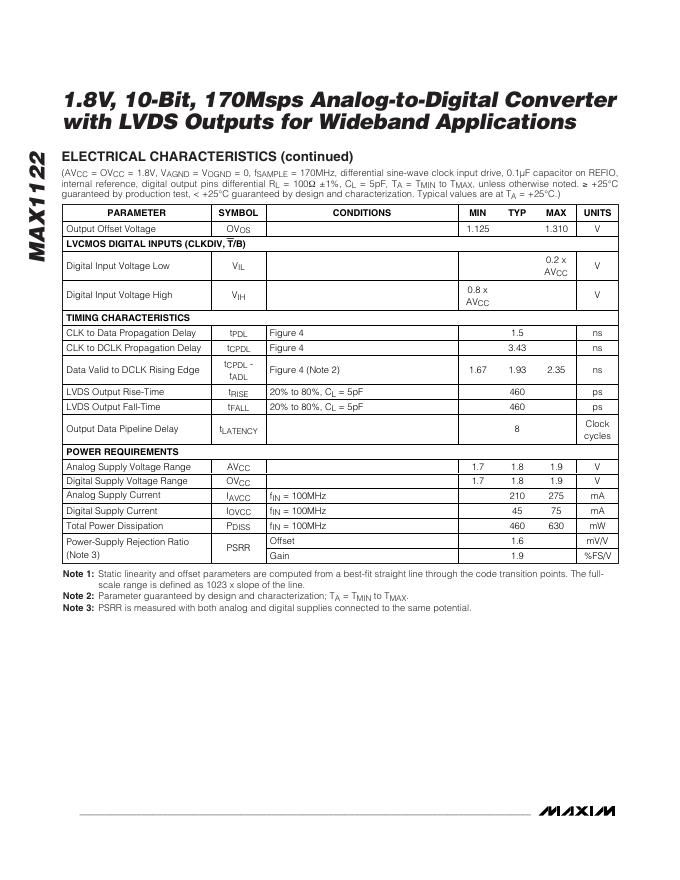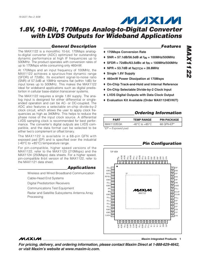 MAXIM MAX1122 1.8V, 10-Bit, 170Msps Analog-to-Digital Converter with LVDS Outputs for Wideband Applications 数据手册.pdf