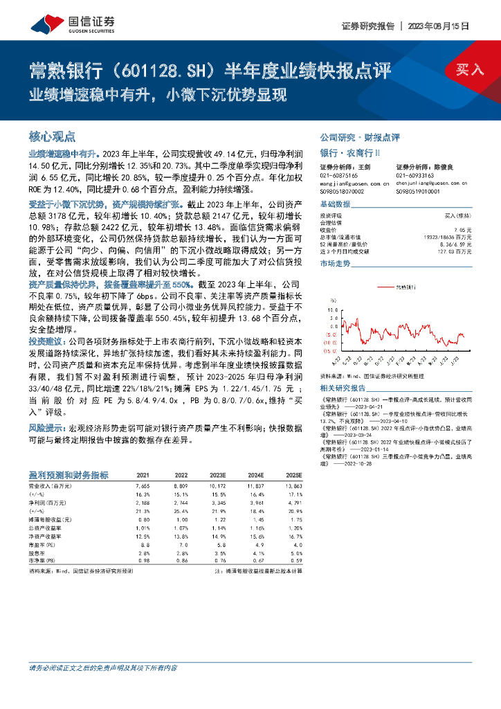 国信证券:常熟银行(601128)-半年度业绩快报点评:业绩增速稳中有升,小微下沉优势显现.pdf