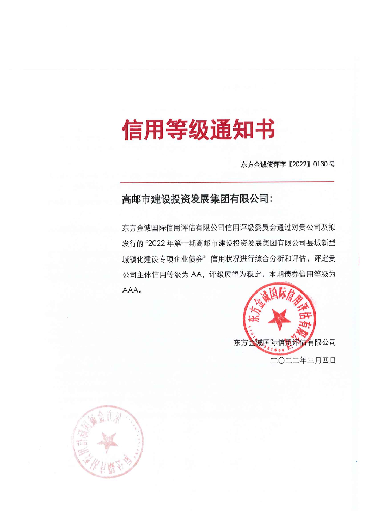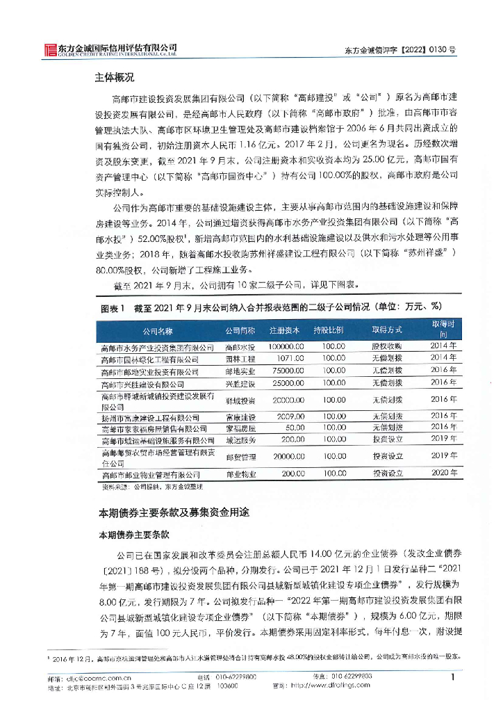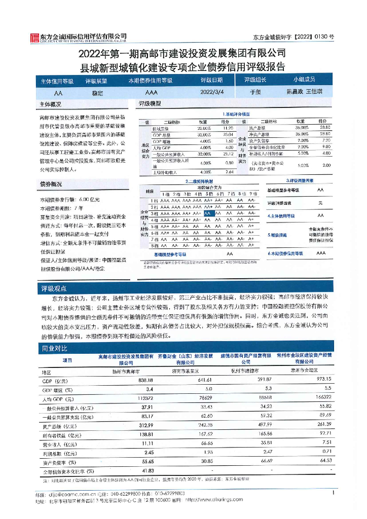 东方金诚:2022年第一期高邮市建设投资发展集团有限公司县城新型城镇化建设专项企业债券信用评级报告.pdf