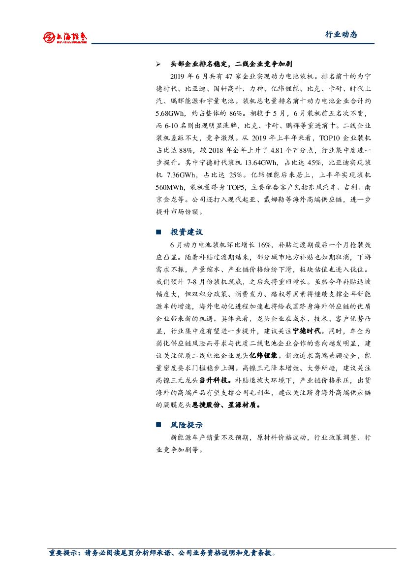 上海证券:2019年6月动力电池装机数据点评:过渡期内抢装效应凸显,二线企业洗牌加剧.pdf