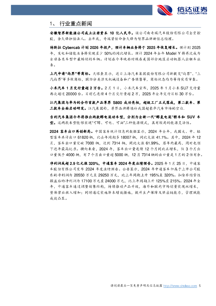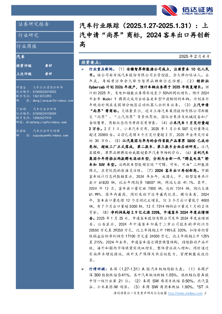 信达证券:汽车行业跟踪:上汽申请“尚界”商标,2024客车出口再创新高.pdf
