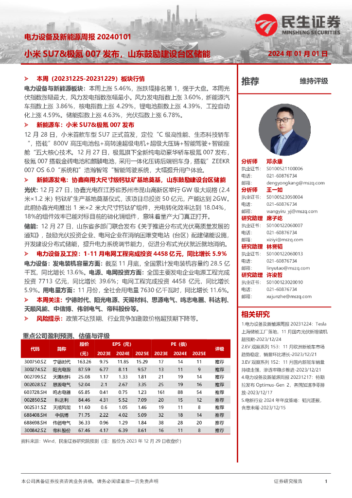 民生证券:电力设备及新能源周报:小米SU7&极氪007发布,山东鼓励建设台区储能.pdf