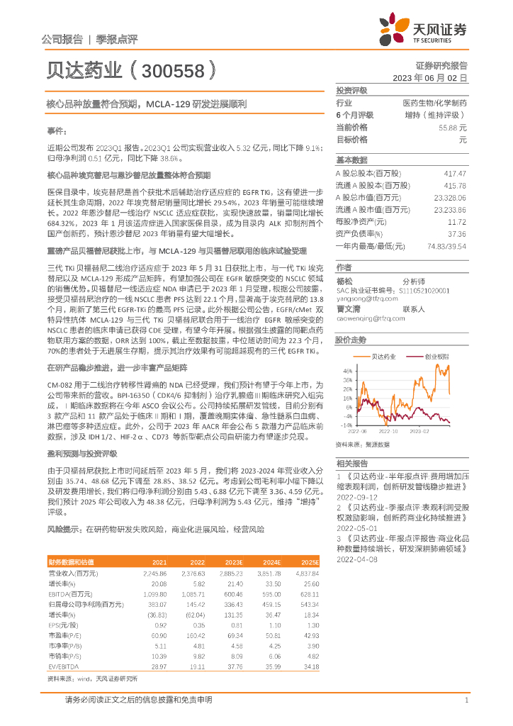 天风证券:贝达药业(300558)-核心品种放量符合预期,MCLA-129研发进展顺利.pdf