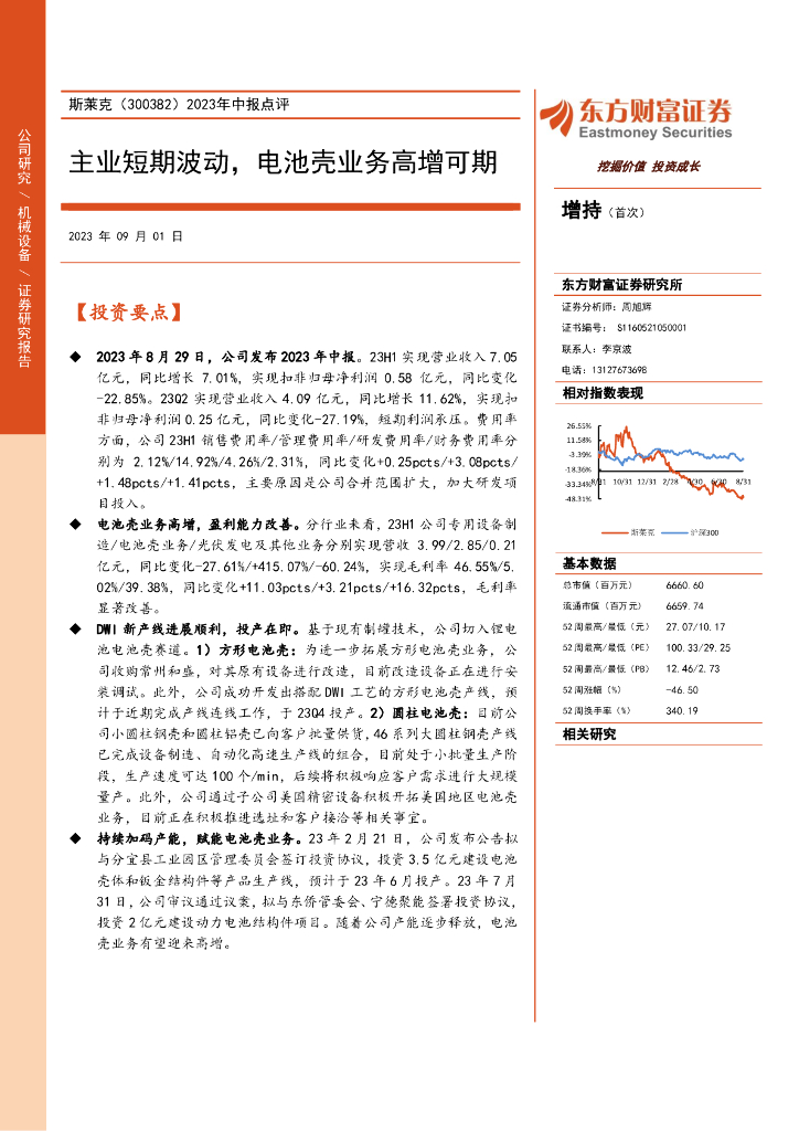东方财富证券:斯莱克(300382)-2023年中报点评:主业短期波动,电池壳业务高增可期.pdf