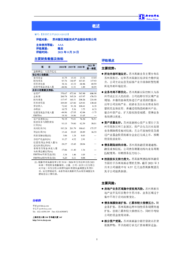 新世纪:苏州新区高新技术产业股份有限公司信用评级报告.pdf