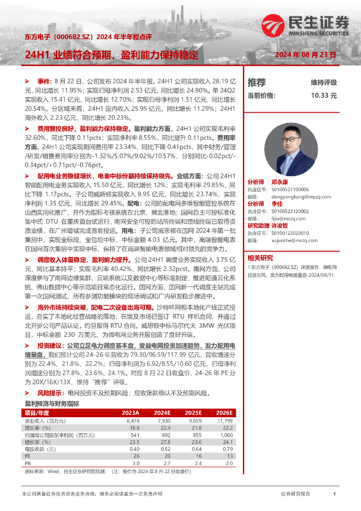 民生证券:东方电子(000682)-2024年半年报点评:24H1业绩符合预期,盈利能力保持稳定.pdf