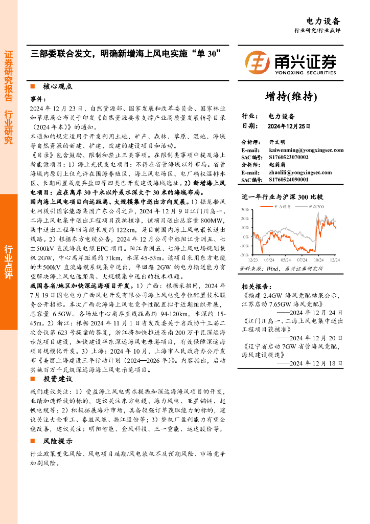甬兴证券:电力设备行业点评:三部委联合发文,明确新增海上风电实施“单30”.pdf