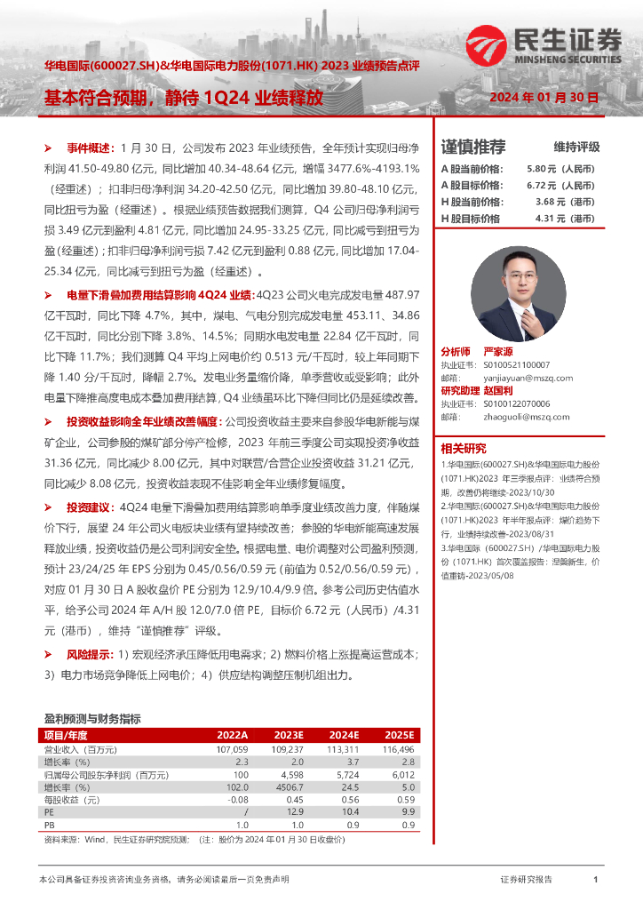 民生证券:华电国际(600027)-2023业绩预告点评:基本符合预期,静待1Q24业绩释放.pdf