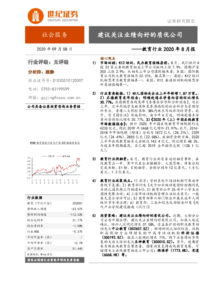 世纪证券:教育行业2020年8月报:建议关注业绩向好的质优公司.pdf