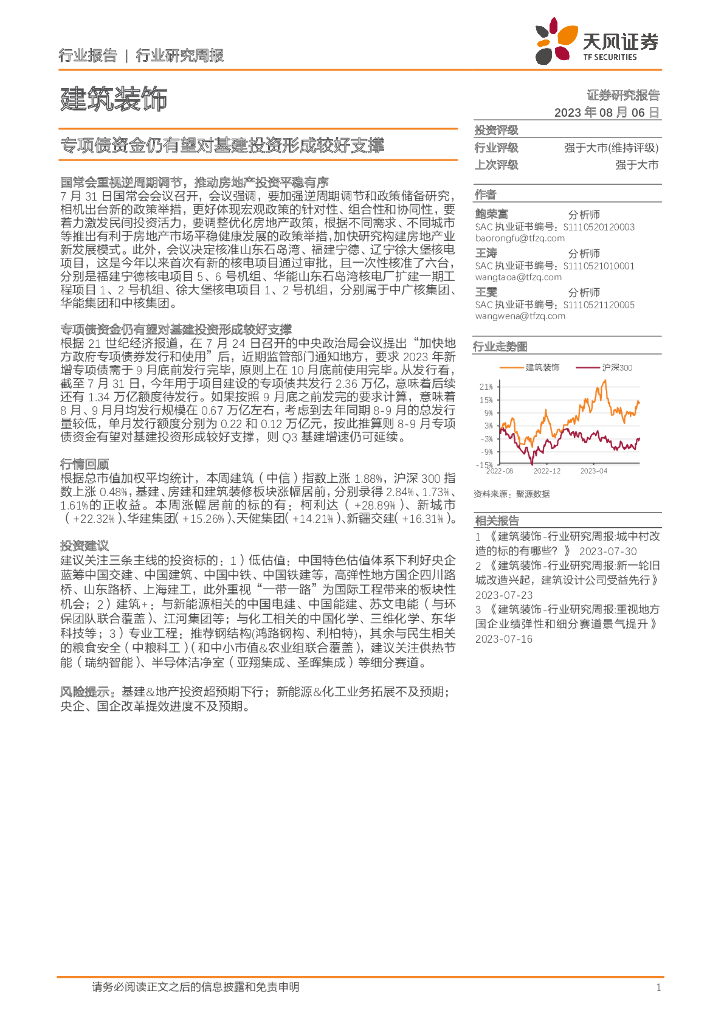 天风证券:建筑装饰行业研究周报:专项债资金仍有望对基建投资形成较好支撑.pdf