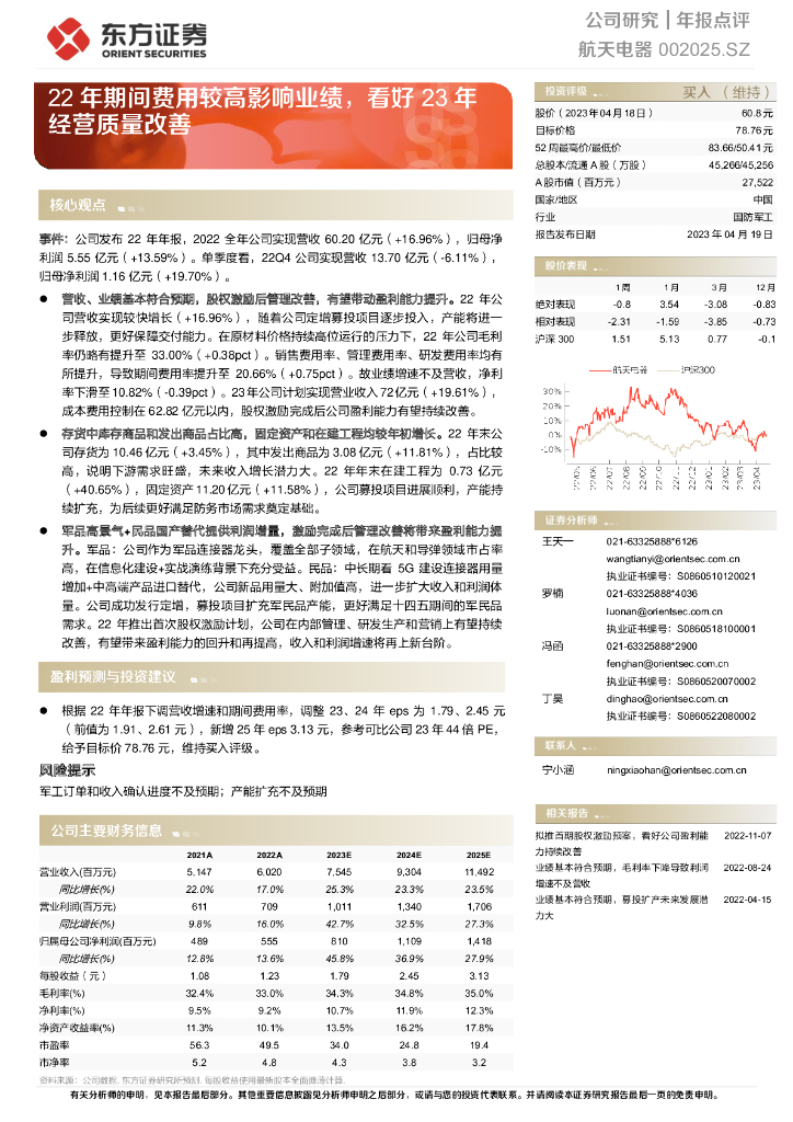 东方证券:航天电器(002025)-22年期间费用较高影响业绩,看好23年经营质量改善.pdf