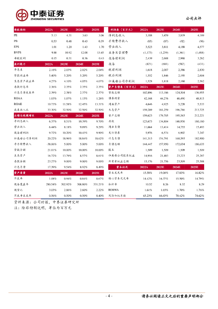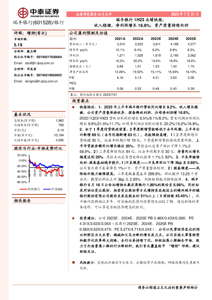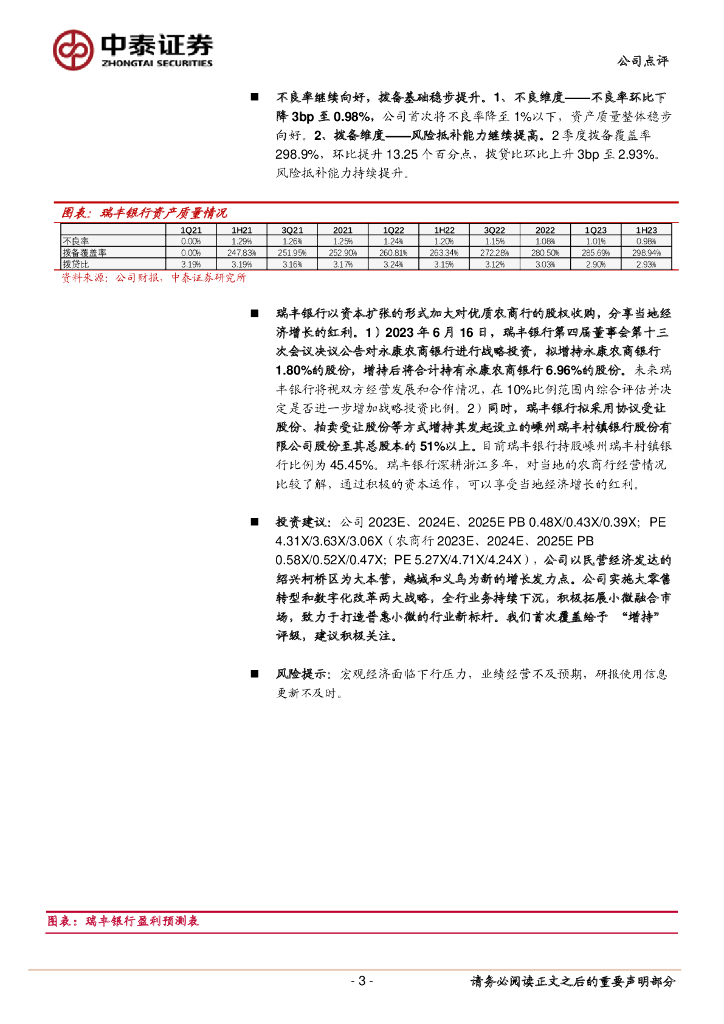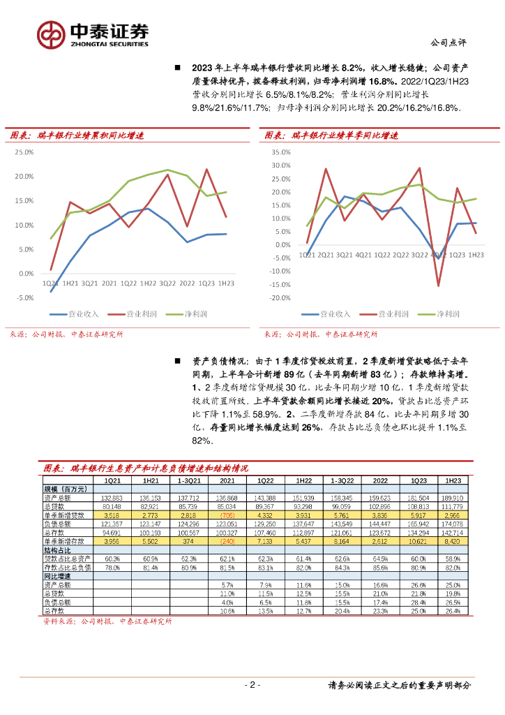 中泰证券:瑞丰银行1H23业绩快报:收入稳健,净利润增长16.8%;资产质量持续向好.pdf