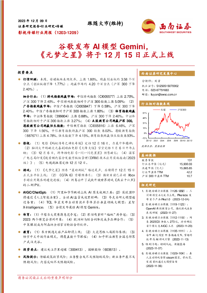西南证券:影视传媒行业周报:谷歌发布AI模型Gemini,《元梦之星》将于12月15日正式上线.pdf
