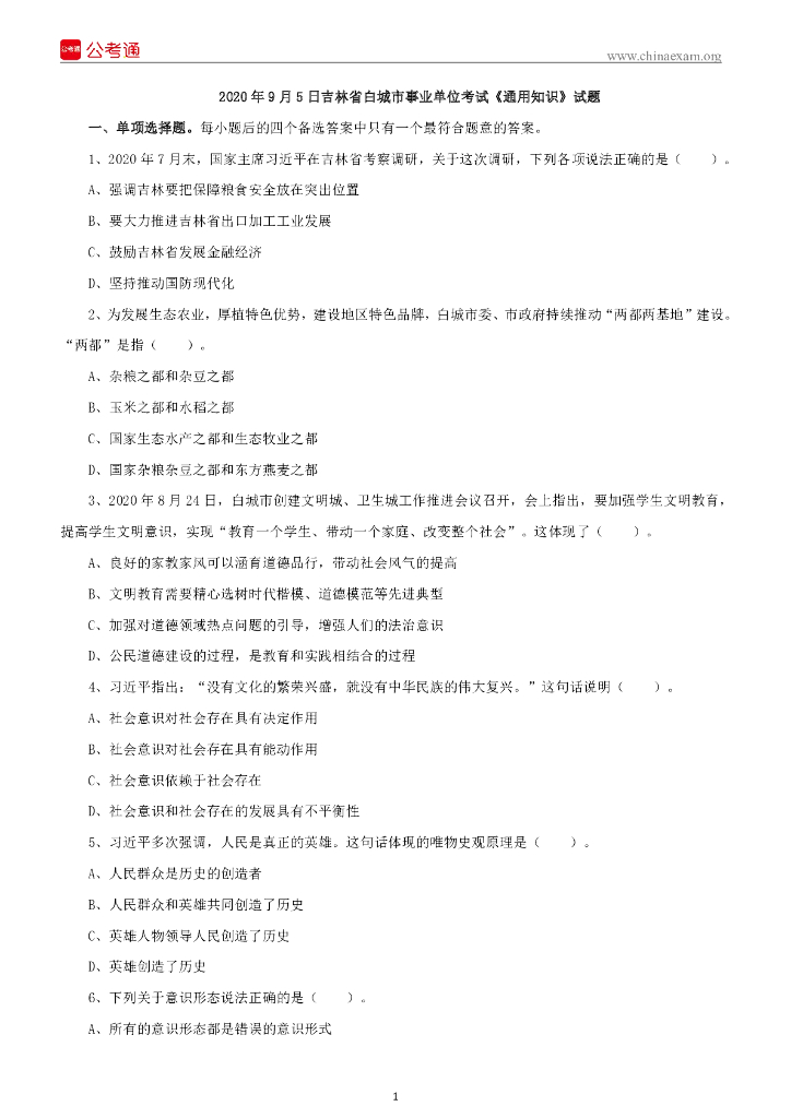 2020年9月5日吉林省白城市事业单位考试《通用知识》试题.pdf