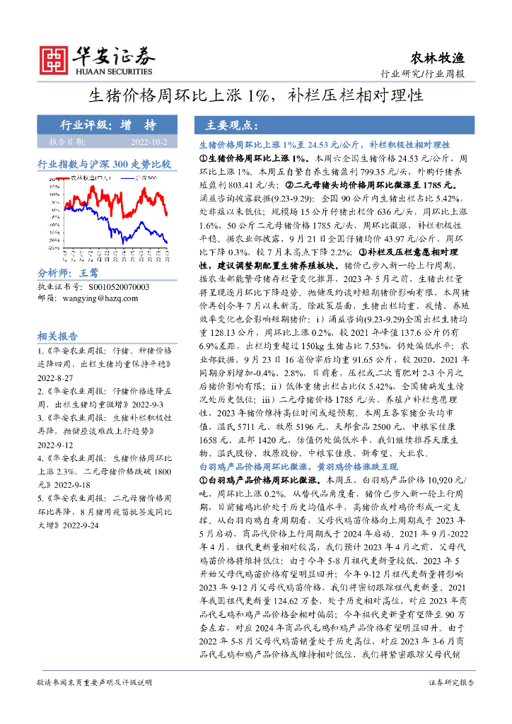 华安证券:农林牧渔行业周报:生猪价格周环比上涨1%,补栏压栏相对理性.pdf