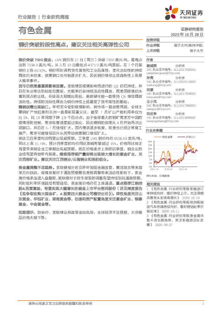 天风证券:有色金属行业:铜价突破阶段性高点,建议关注相关高弹性公司.pdf