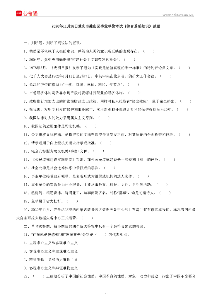 2020年11月28日重庆市璧山区事业单位考试《综合基础知识》试题.pdf