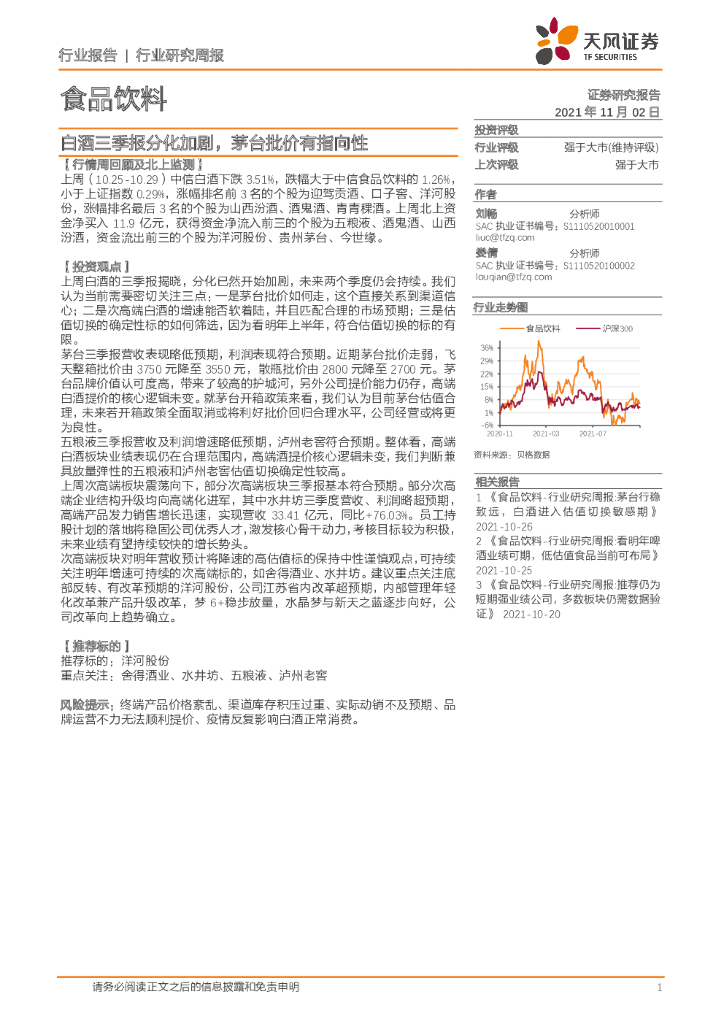 天风证券:食品饮料:白酒三季报分化加剧,茅台批价有指向性.pdf